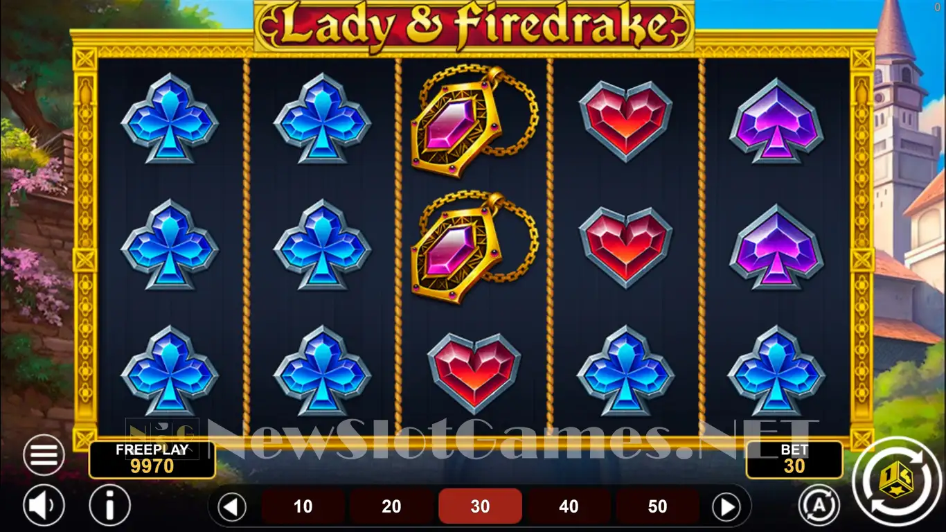 Lady & Firedrake slot places its reels right next to a medieval castle. You might believe that it’s only the Middle Ages being put on display inside, but the presence of a dragon tells us that the story is borrowing from the fantasy genre as well. There are symbols on those reels that include gemstone-made card suits, jewelry, a Faberge Egg (could be a dragon egg set in gold), and a Princess. The Dragon is present as a wild symbol.