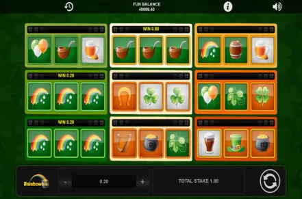 When it comes to symbols, you get the Pot of Gold, which pays the most, followed by Leprechaun’s Hat, a Celtic logo, Horseshoes, Harps, Four-Leaf Clovers, Three-Leaf Clovers, Pint of Guinness, Beer Mug, Bottles, Kegs, Leaves, Pipes, the Irish Flag, Balloons and the Rainbow.