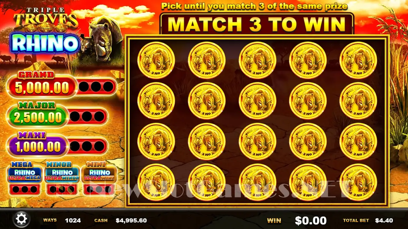 Yes! NewSlotGames offers the latest version of the Triple Troves Rhino demo game directly from Ainsworth servers.