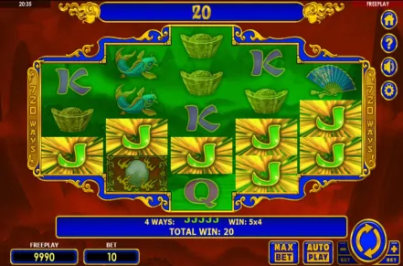 Both its theme and it's graphics style I’d consider average choices. The developer went with the very common Chinese theme, using dragons and Phoenix birds, along with turtles and frogs, all being among the legendary creatures of the country’s stories. You have things like fish, pearls, gold ingots, hand fans, toads, or paper lanterns among its other symbols, with the Royals at the rear.