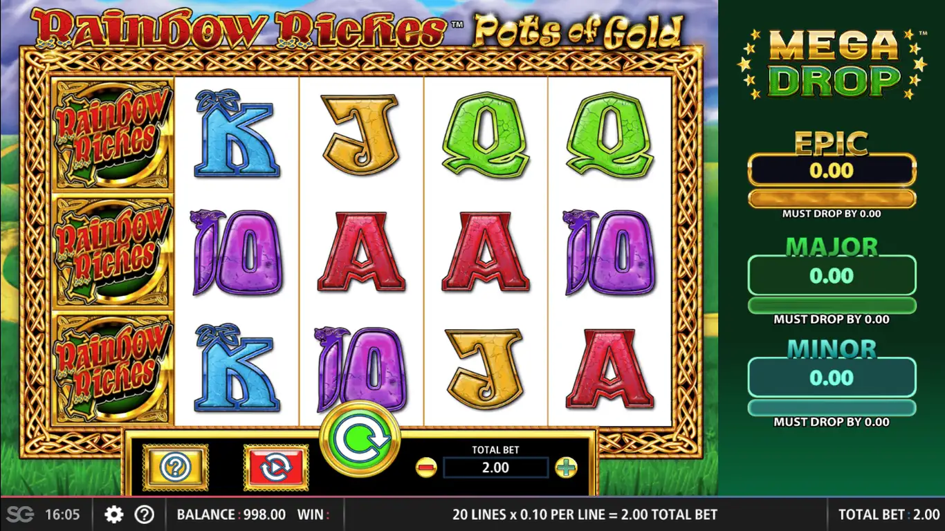 Rainbow Riches: Pots of Gold works through the standard 5x3 reels and 20 lines that we see in plenty of slots, and it uses them to deliver wins of up to 500x the stake in the base game, and up to 5,000x the stake during certain features. Add the Mega Drop progressive jackpots to the list of payouts that can trigger through it, and at that point I quite like the RTP that the game ends up with, of 96.40%. It’s going to have fairly high volatility though. There isn’t a lot inside when it comes to big features, only wilds scatters and a bonus feature.