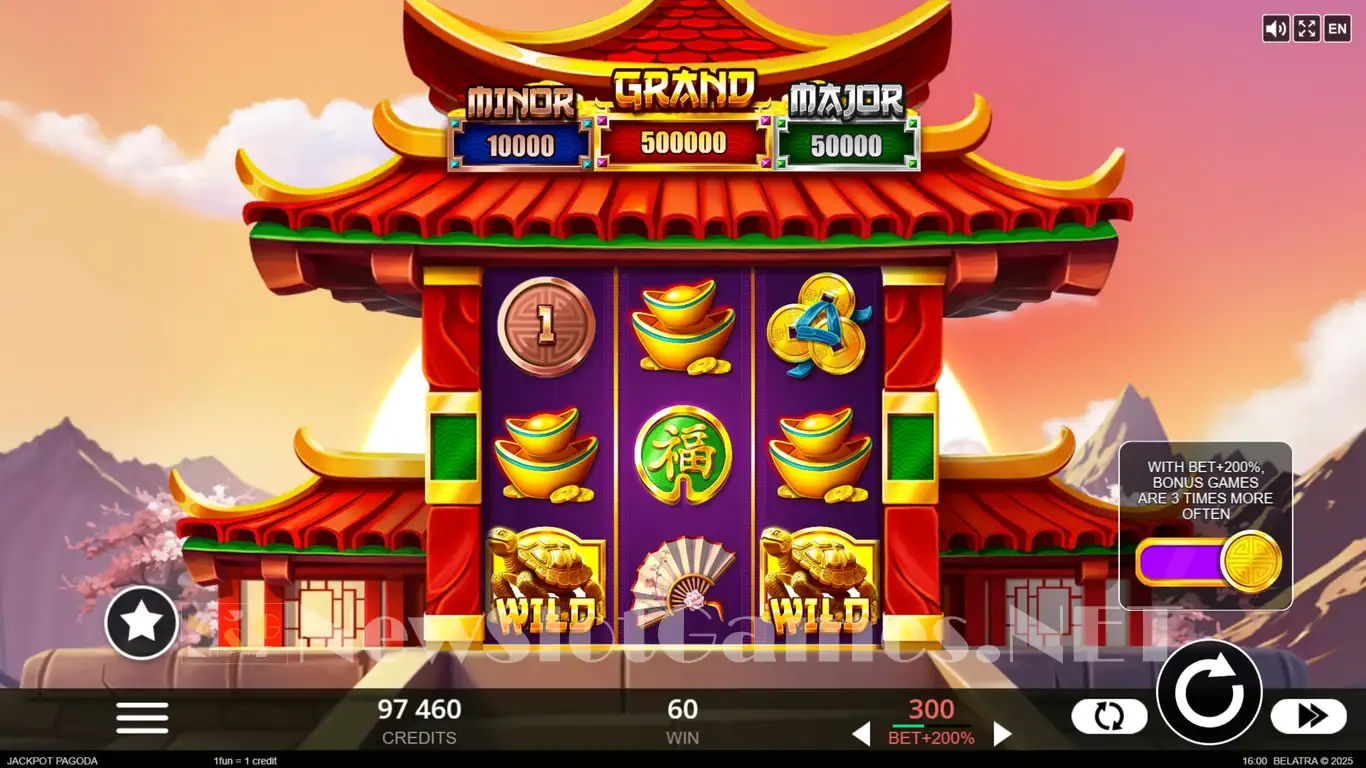 Jackpot Pagoda belongs to a huge category of Asian-themed online slots. In this particular case, it’s a release from Belatra Games, designed to offer 3x3 reels and 5 active lines, with a connection to the classic genre that’s not that common in this category. You get plenty of risk along the way, in a high volatility environment, but you also have a 10,000x top jackpot as the ultimate reward. The 96.11% RTP tells us that it’s a fair game, though. Betting in Jackpot Pagoda starts from $0.10, and it can get all the way up to $250.