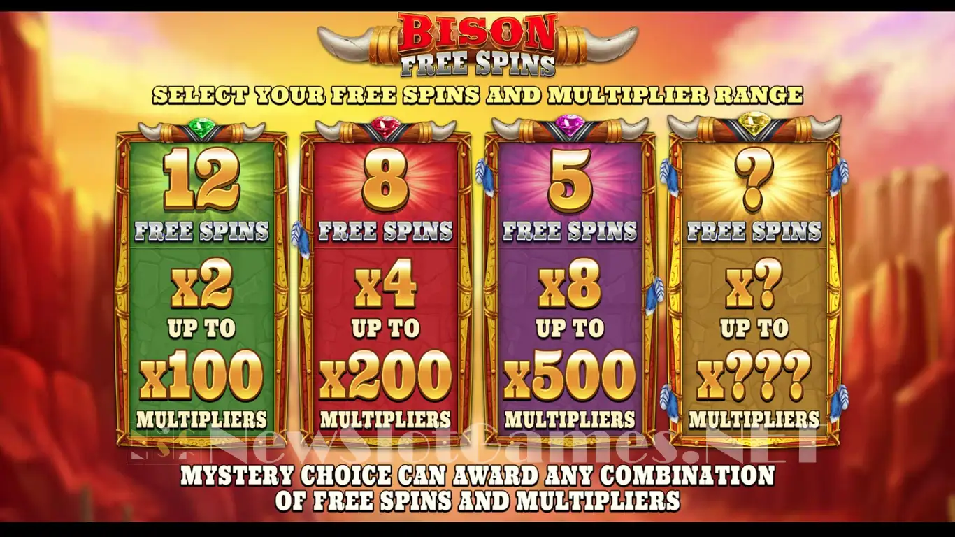 Another way to play is by using Bonus Buys of 100x the stake, where you can get up to 20 free spins and up to 500x multipliers (Bison Wheel or direct access to the free spins).