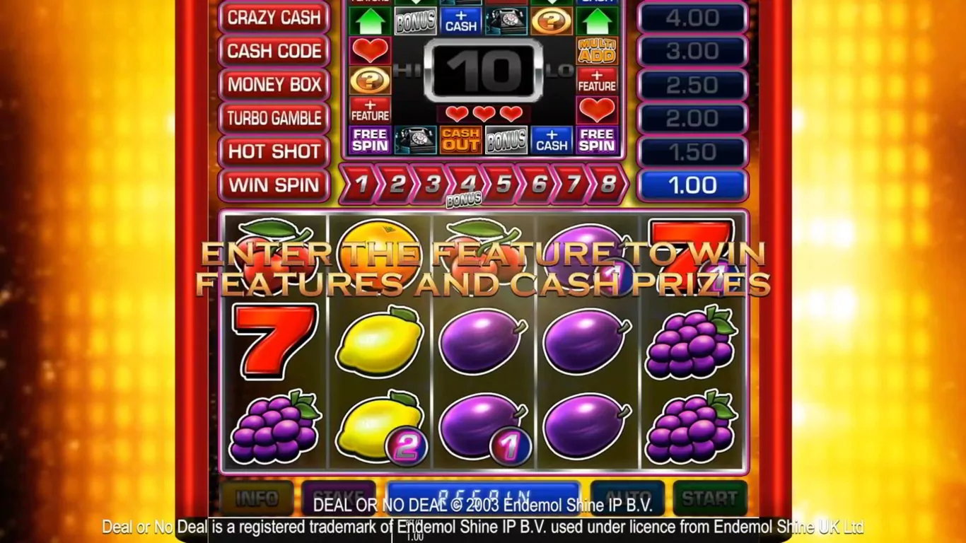 Deal or No Deal: Double Action has a long list of potential features that you can trigger, as you go through it. You see them all listed on the left side of the paytable area, with names like Win Spin, Hot Shot, Turbo Gamble, Money Box, Cash Code, Crazy Cash, Cash Climb, Reel Rush, Box Clever, Big Reads, Star Prize, Cash Combo, Bank On It, Box Magic, Powerplay and Big Money. Each one is a little bit different and gives you its reward in a different way, so it’s to be appreciated the variety in the features that are available in this game.