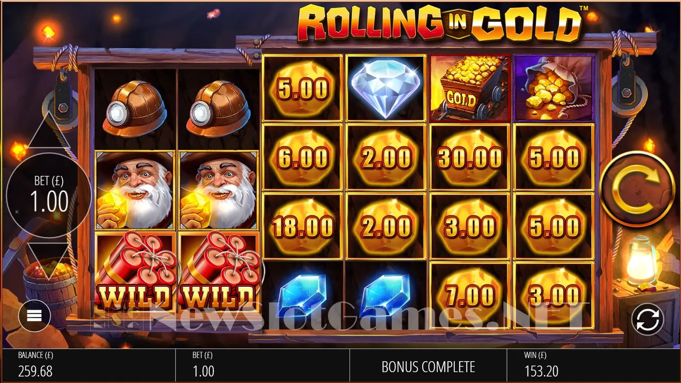 The game turns the Gold Nugget symbols sticky, and then gives you 3 respins in a game area which uses only the last four reels (4x4 reels). You try to get more Nuggets or Diamonds. The appearance of additional Nuggets makes them sticky and resets the number of respins. At the end of the feature, each Gold Nugget pays a cash prize.