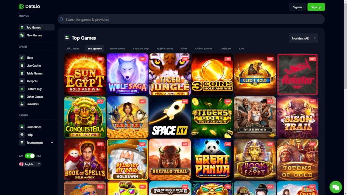 The extensive Bets.io collection of online casino games includes over 5,000 titles of different types and to various preferences. It has established cooperation with more than 40 software providers. Casino clients can dive into gambling with the titles released by Evolution, Booming Games, Pragmatic Play, Wazdan, Nolimit City, and many other game developers.
