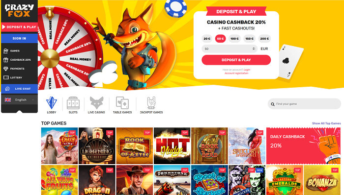 - Cashback 20% - Every player at CrazyFox Casino will have the chance to receive a cashback offer of 20% for all their net losses the previous day. The only condition to qualify for the promotion is to have lost 5 EUR on slots or casino games.