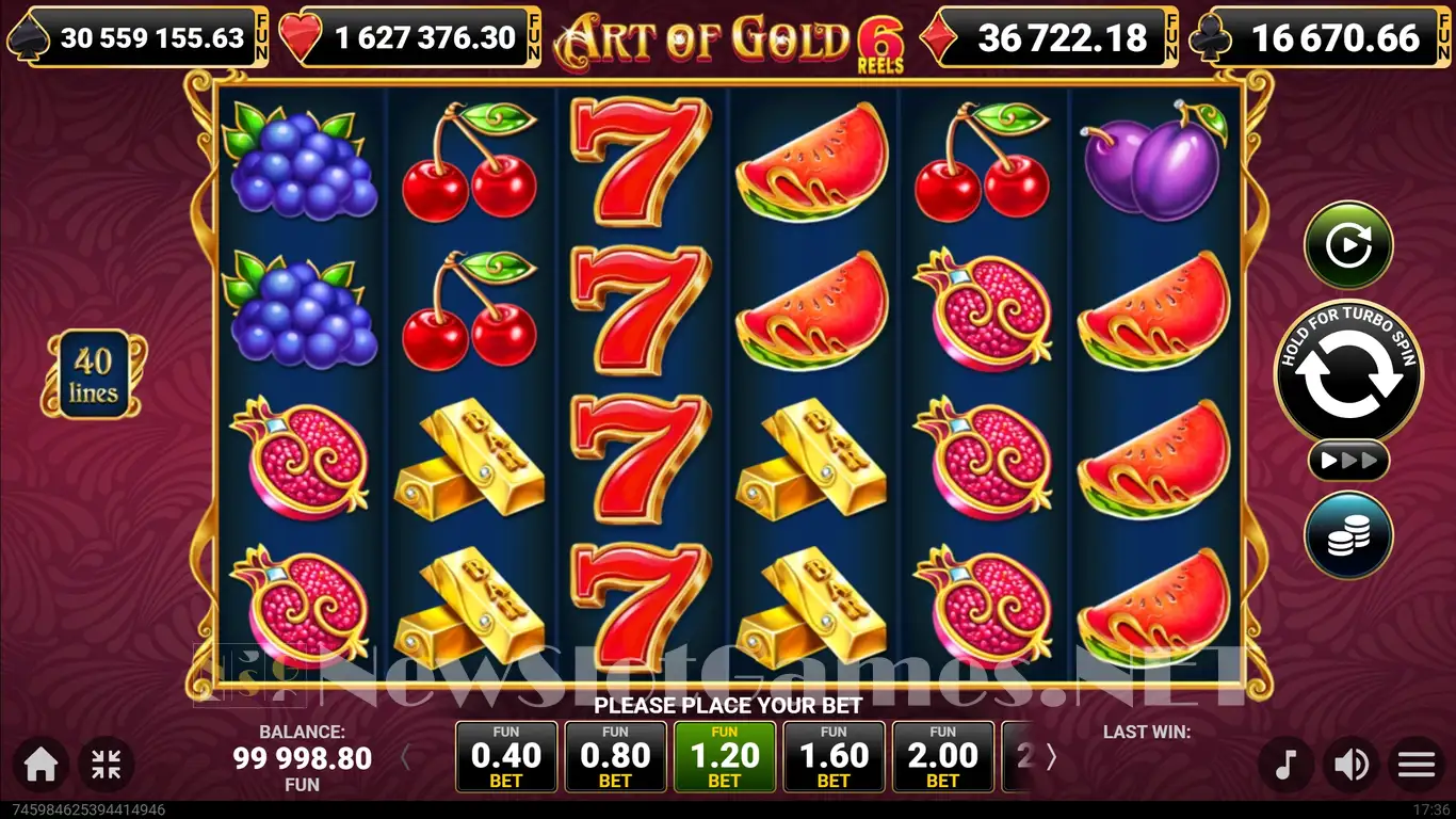 Yes! NewSlotGames offers the latest version of the 40 Art of Gold 6 Reels demo game directly from Amusnet (EGT) servers.