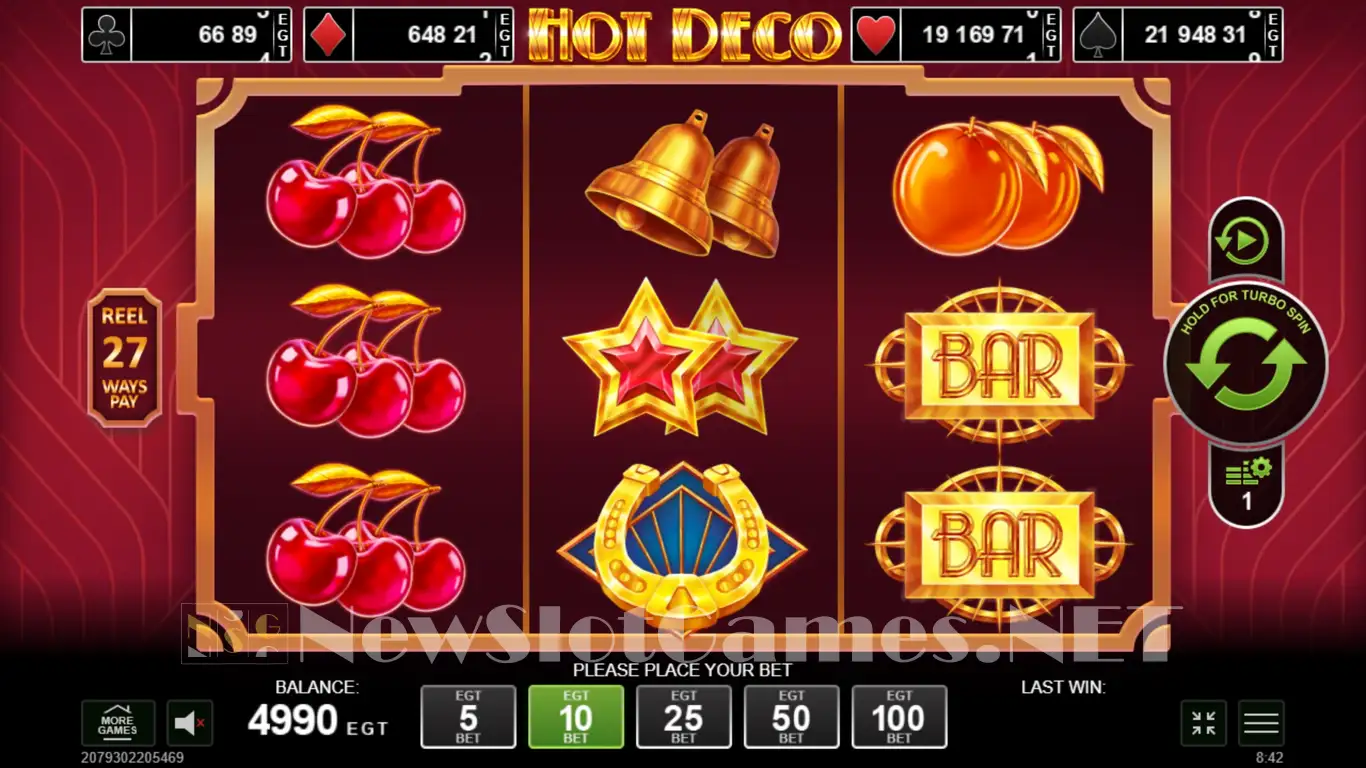 Yes! NewSlotGames offers the latest version of the Hot Deco demo game directly from Amusnet (EGT) servers.