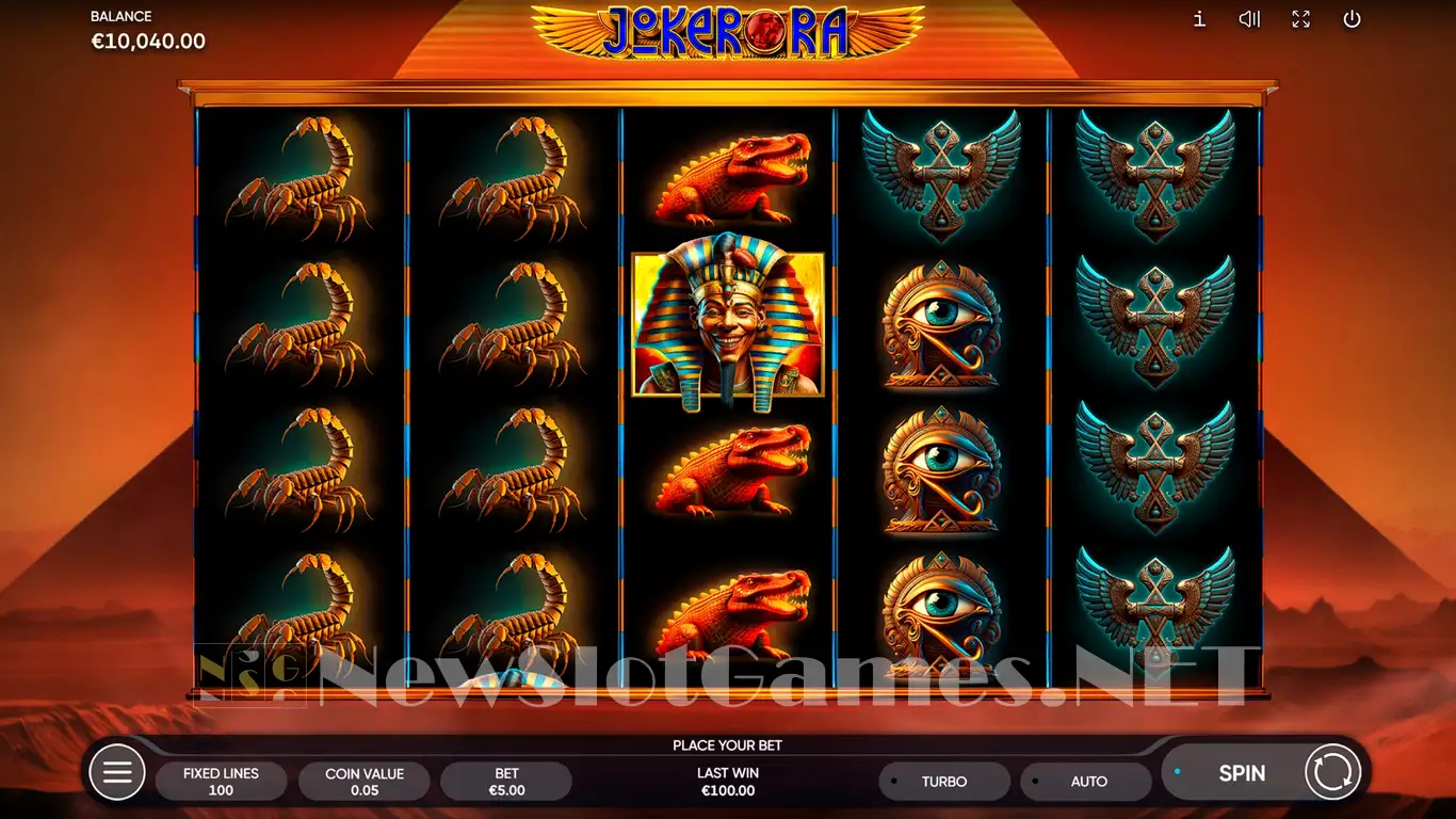 Joker Ra places 5x4 reels before the player, with 100 fixed lines always active. The slot’s top jackpot is not mentioned, though we can calculate a potential of 3,000x the stake. With the RTP at 96.07%, one doesn’t have to worry about the slot not being fair. Expanding wilds and simple scatters are going to be available as its only features.