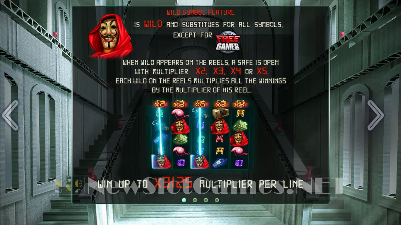 The Wild is a masked person with a red hood and they do a bit more than their traditional role. This means that you’ll get a symbol in aid when you need a win, but you’ll get some more. When a Wild lands on the reels a safe is unlocked and you’ll get a 2x, 3x, 4x, or 5x multiplier that multiplies all the wins per reel. This feature gives you the chance to win a reel prize that’s 3,125x the stake.