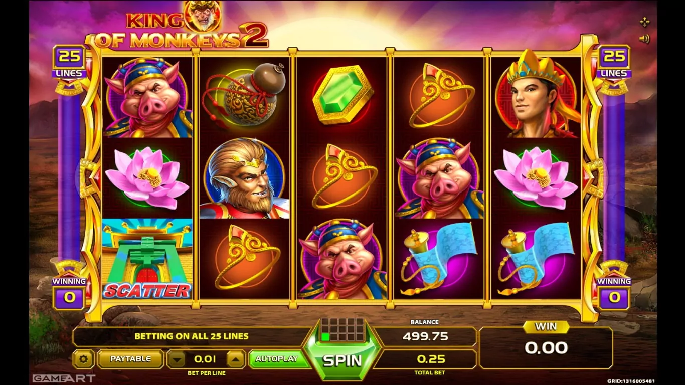 For King of Monkeys 2, GameArt went with a setup that has 5 reels making room for 25 fixed lines every single round. There are individual wins of $1,000 and potential jackpots of $25,000 to be won each round, but there are also wild symbols, scatters or free spins that you could be enjoying.