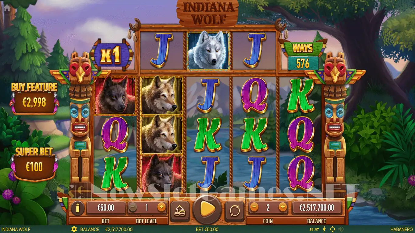 Indiana Wolf is a wolf-themed slot, with elements borrowed from Native American culture being added in several places, particularly through decorations. Check out its symbols, and you will find the usual images of Royals and Wolves that you’d expect from such a theme. Wolves come in several variants, colored white, black, or gray.
