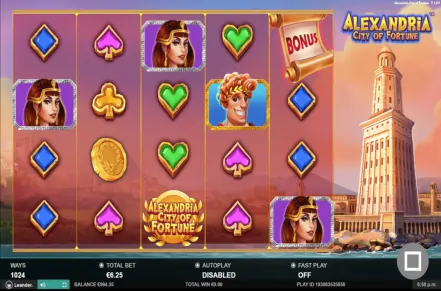 Alexandria: City of Fortune takes us back a few thousand years, to the times when the great city of Alexandria was made famous. Founded by Alexander the Great, it houses the Library and Lighthouse of Alexandria, two world renowned constructions. Now, we get a cartoon-style slot machine that’s based on it, and it’s thanks to Leander Games that this is the case.