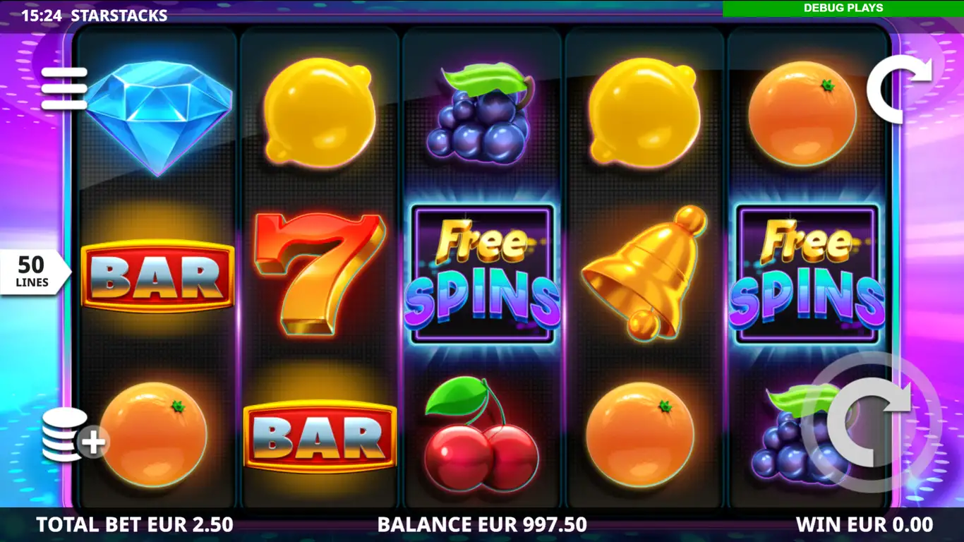 About the least fun part about Starstacks is going to be the theme it uses. It’s a classic fruit slot, even though the game area holds a lot of active lines. The symbols include bonus symbols with cards, but also wild stars, diamonds, lucky 7s, bells, grapes, oranges, lemons or cherries.