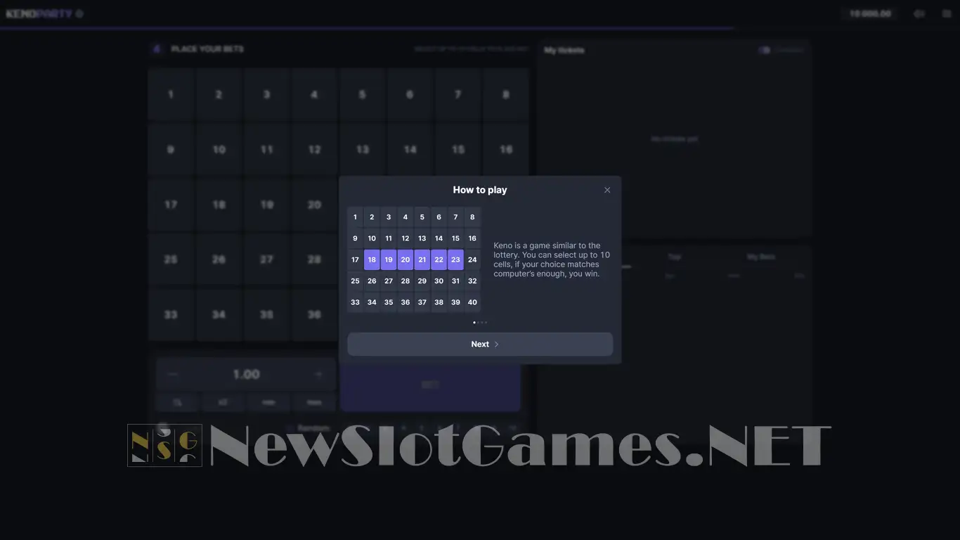 The game of Keno is played in a lottery-style environment. You have 40 numbers to choose from (going from 1 to 40), and you have to pick 10. Place your bet on up to 5 tickets (once the 10 cells are selected, you click on the BET button, and this is done for each ticket). If you don’t want to do this manually, each round, you can use Autoplay.
