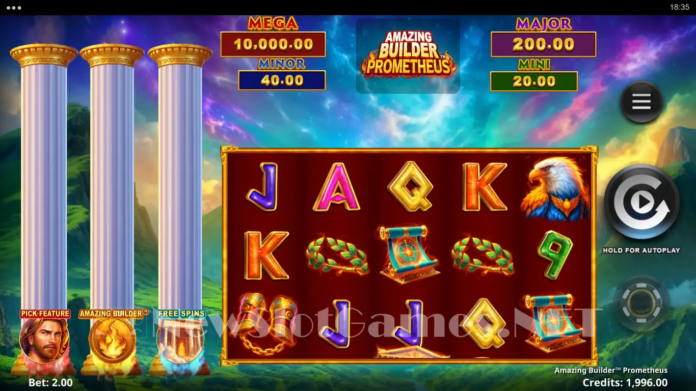 The action in Amazing Builder Prometheus revolves around one of the gods of Ancient Greece, and we see him in one of the major symbols used on its reels. There are also images of temples, fire, scrolls, eagles, and wreaths, all of which are useful in feature or premium combinations. Lower-value wins will come from Royal symbols.