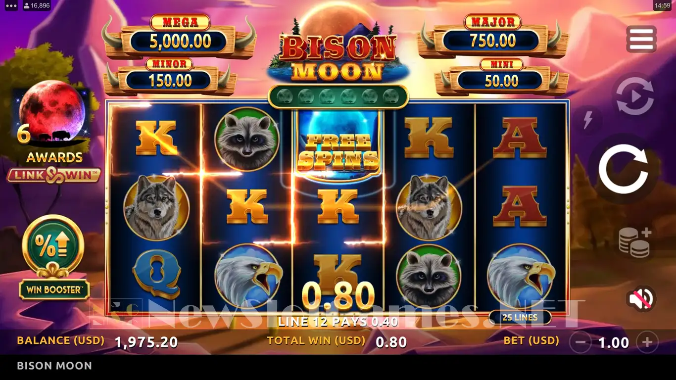The 5 reels available in Bison Moon are going to give you 25 win lines. Once you take into account the game’s free spins, Link & Win respins, and regular wilds, it’s not a surprise that it could pay up to 12,500x the bet ($250,000). On the other hand, neither is the slot’s high volatility a surprise, though the 96.08% RTP somewhat sweetens it.