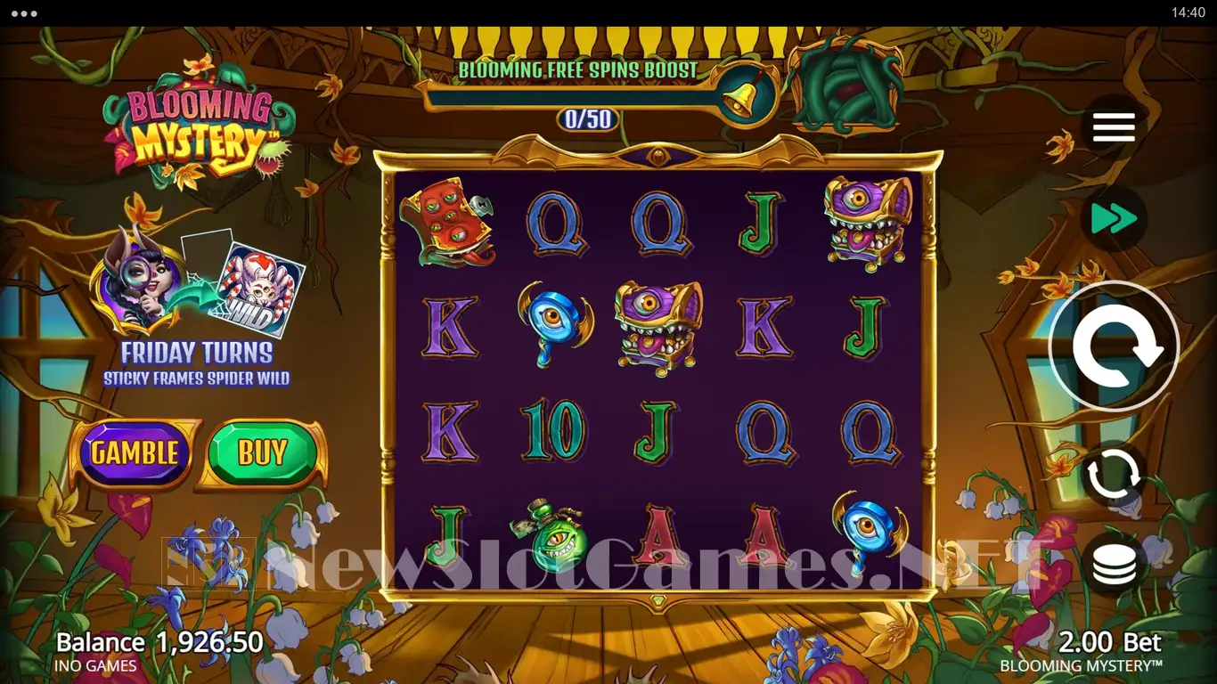 The action of Blooming Mystery appears to take us into a haunted mansion, a place where you can find flowers growing and a fairly dark room otherwise. On the reels, its symbols will start you off with the usual Royals, but they make a move to potions, magnifier glasses with bat wings, spell books showing tongues, and treasure chests turned into monsters. There is also a witch in the lead role.
