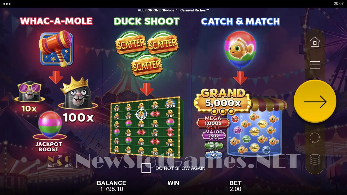 You can expect a typical setup, with 5 reels occupied by 25 active paylines. It’s accessible, which we know because of its medium volatility rating, and yet it can pay a fair top prize of 5,000x the stake. The RTP of Carnival Riches can reach its highest level at 96.20%. Major features of the game would be the wild, along with bonus games like Duck Shoot, Whac-A-Mole, or Catch & Match.