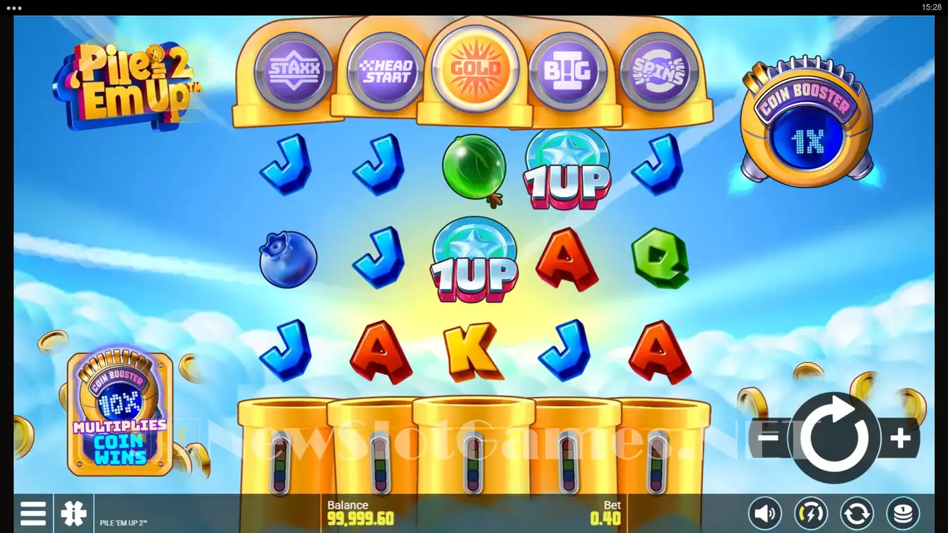 You get a Cash Collection mechanic as well. It involves the Coins with prizes (and potentially with multipliers from the Booster, going up when 1Up symbols land) and the Collect symbol if it shows up on the 5th reel.