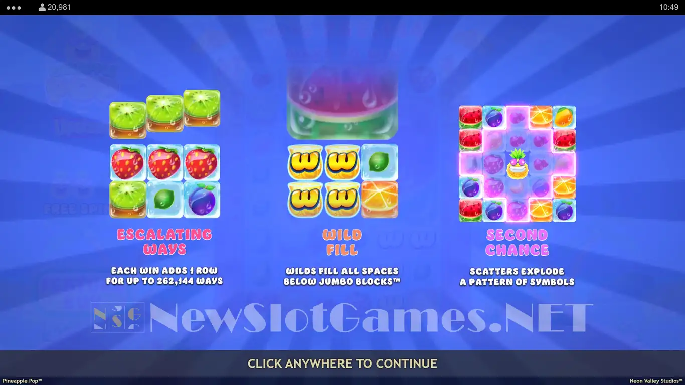 The only other major feature that’s present in Pineapple Pop is that the free spins require the presence of three scatter symbols or more. You receive 6 to 15 free spins when those requirements are met. The winning rounds each increases the game area and will keep it that way (it doesn’t reset between spins to the original 6x4 reels). You’re also guaranteed that all wilds will be part of winning combinations; they don’t go away until that happens.