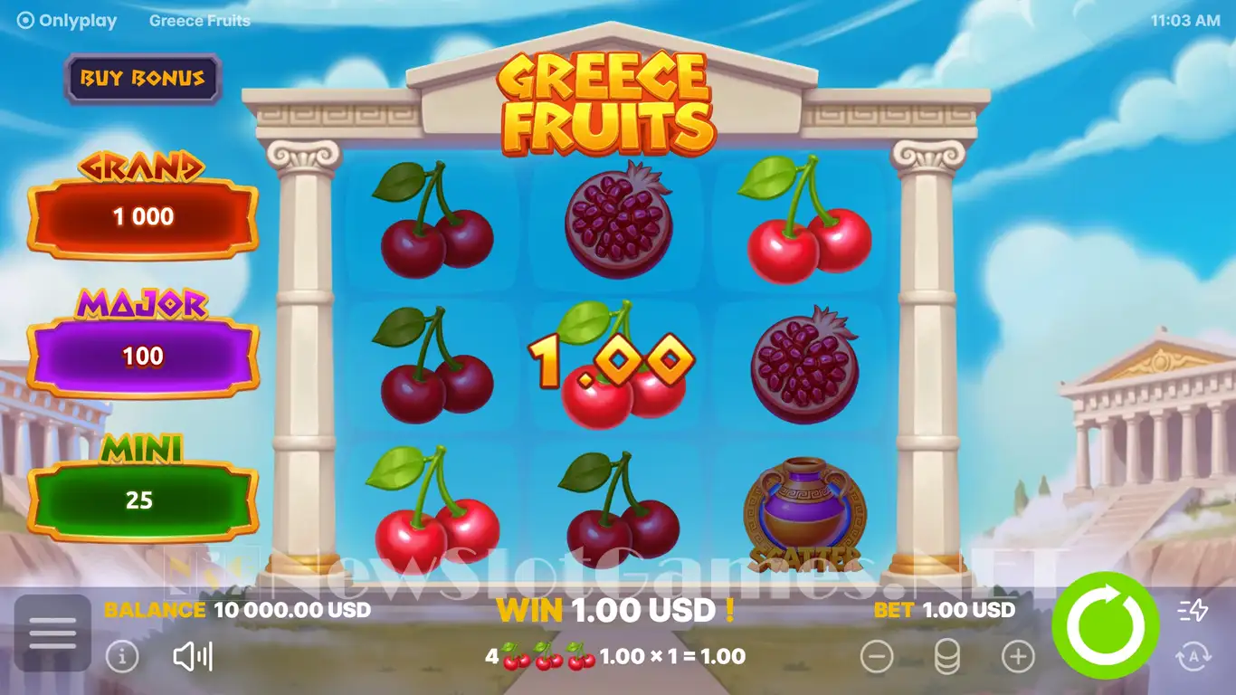 Yes! NewSlotGames offers the latest version of the Greece Fruits demo game directly from Onlyplay servers.