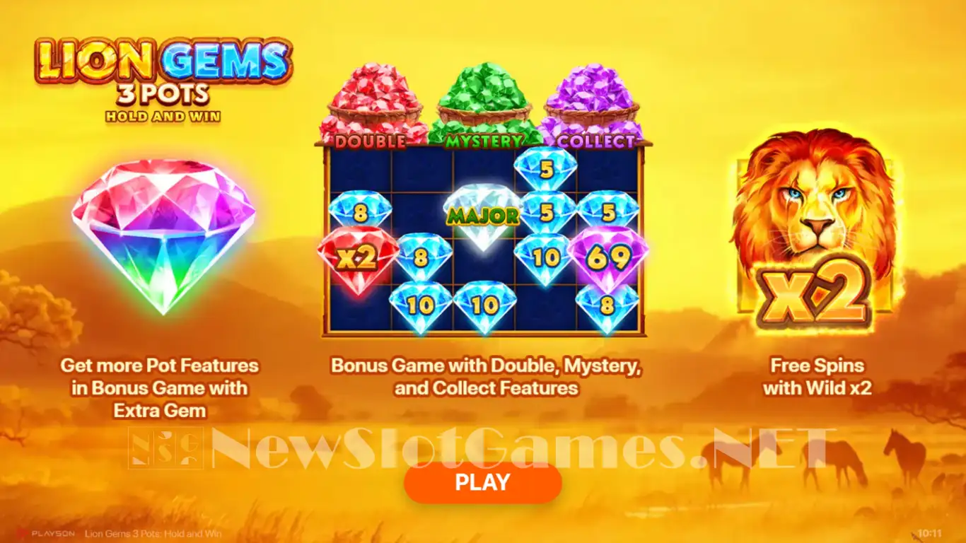 Yes! NewSlotGames offers the latest version of the Lion Gems 3 Pots Hold and Win demo game directly from Playson servers.
