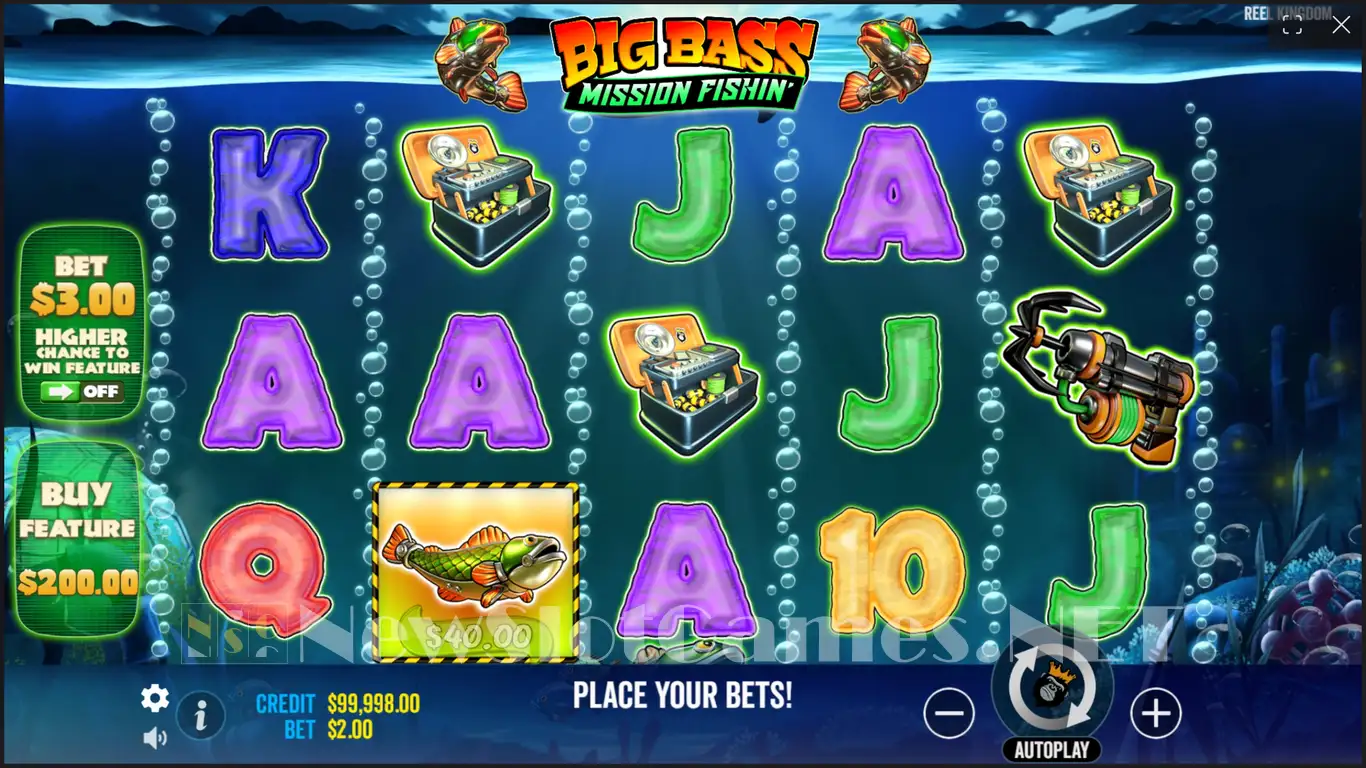 Like every other slot machine in this series, it’s fishing-themed, and the graphics will likely feel familiar to you. The Fisherman now looks like a diver ready for a special ops mission, and some of the other symbols are transformed to suit that idea (the fishing rod is now a hook-throwing pistol, while the lure box has electronic devices inside). There are also more common symbols, such as various fish, dragonflies, or the Royals.