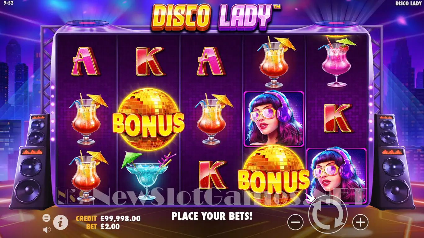 Among the lesser symbols, there are four top Royals initially, with J to A logos. We then have three cocktails, colored in orange, pink, and light blue. The top-paying symbol shows us a young woman, the Disco Lady. A couple of feature symbols are used, marked with the Wild and Bonus logos.