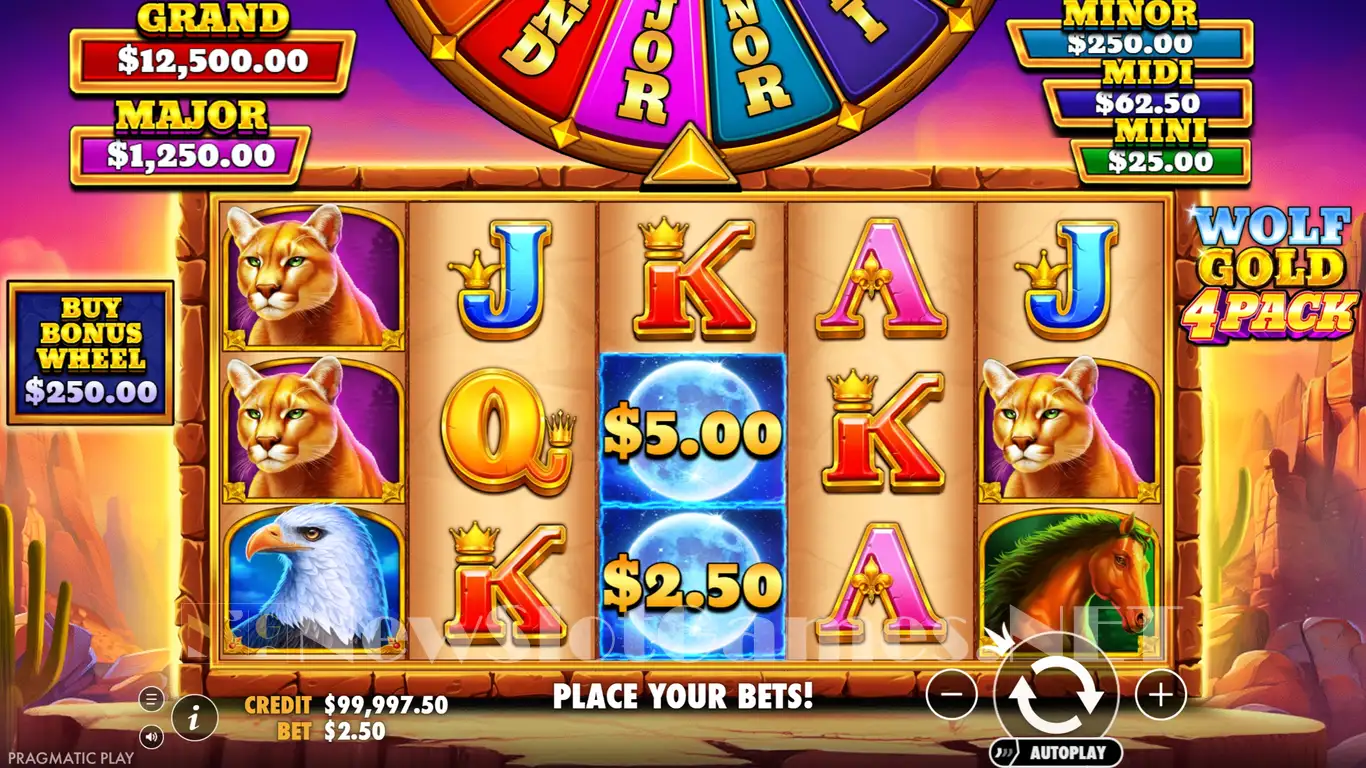 You’re going to find 5x3 reels that have a total of 25 lines, and you will spin them each round, trying to claim that 5,100x top jackpot. While the high volatility rating of Wolf Gold 4 Pack can be an issue, it’s going to be an acceptable option if the RTP is at 96.51%. There are several features included, such as a Bonus Wheel, or respins with the four sets of reels visible at the same time.