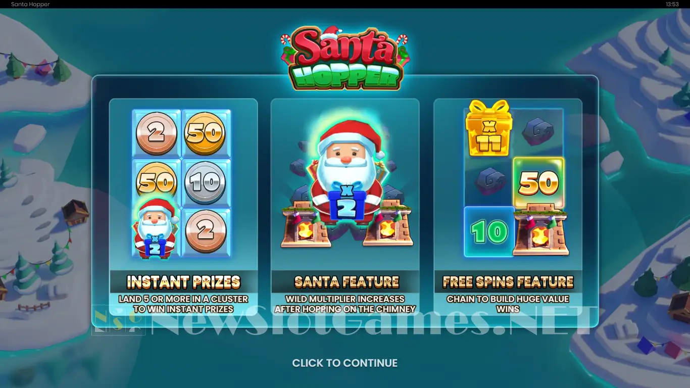 Santa Hopper delivers 7x7 reels, allowing for the Cluster Pays engine to get you paid when the conditions are right. Wins of up to 10,231x the round’s bet are available, though with volatility medium to high, and an RTP range that’s not guaranteed to be set to 96.35%. The features you encounter inside will range from the Bubble and Santa features to Jingle Drop, Cluster Link, and free spins.