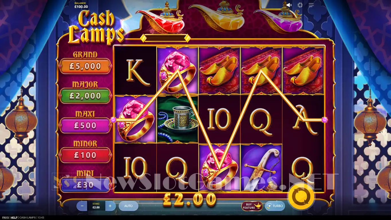 The Lamp Bonus is a respin feature, with 3 initial rounds. As you get cash symbols and gems (of all three types, depending on the trigger), the respins reset. Wins of up to 2,500x the stake are possible from the Grand Jackpot alone, so this is the feature with the highest potential.