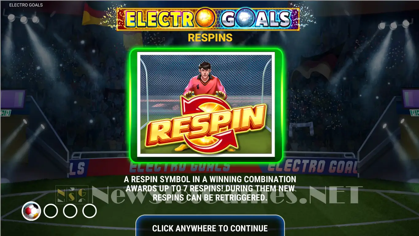 Part of Electro Goals features come from the last two reels, which deliver symbols that can bring you up to 10x multipliers, increased prizes (by up to 1,000 extra coins), but also Respins. To get access to these modifiers, you need to form combinations of 3 symbols on the first 3 reels.