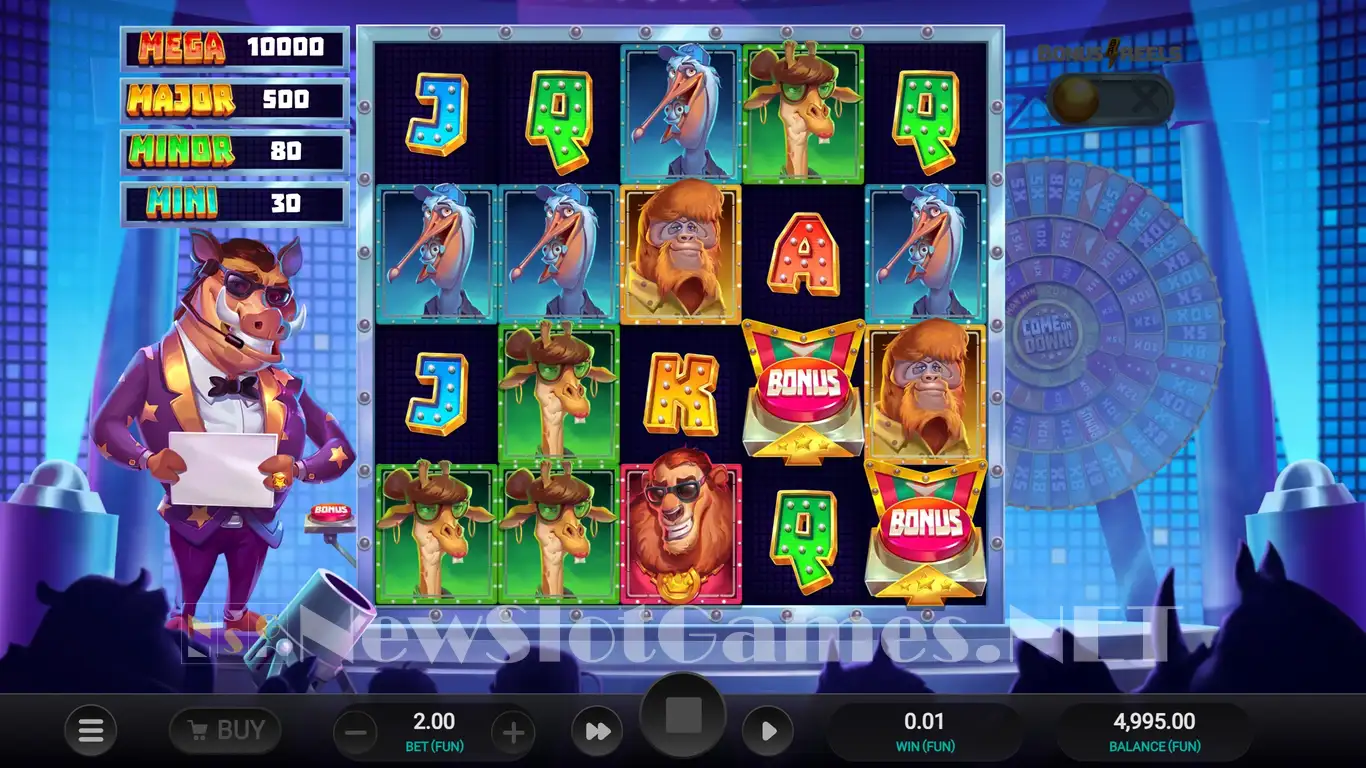 Come on Down, a slot designed by Relax Gaming, is a game-show themed release, with wild animals replacing humans on stage. Designed with 5x4 reels, Come on Down offers 40 paylines for any combinations of 3+ symbols that may form there. With a Mega Jackpot paying 5,000x the stake, the rewards look good enough, but the RTP of this slot is 94%. Betting in this case requires as little as $0.20 for a single spin, but there is the option to go up to $200 for a single round.