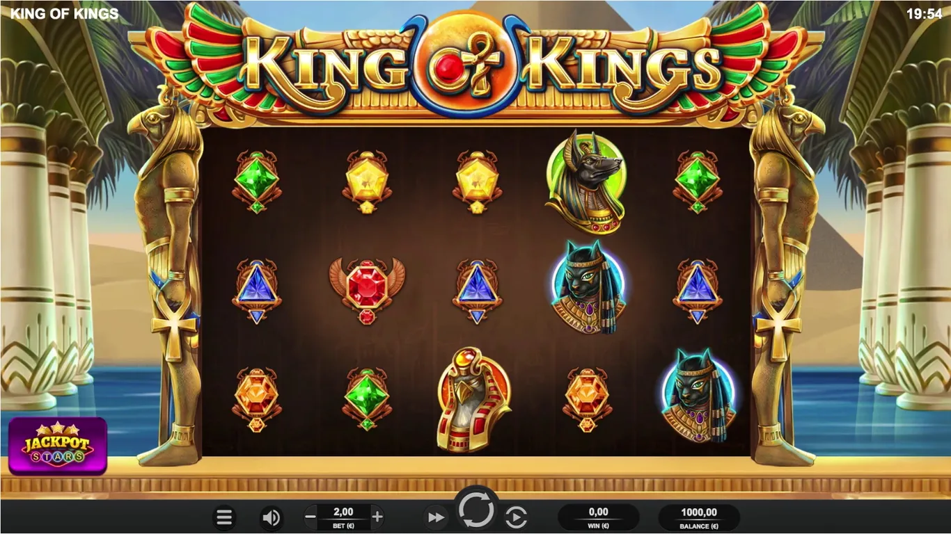 There are 5 paylines in King of Kings, where the betting starts at $0.10 but can go up to $25.00. Now, you can place an additional bet of up to $2.00, to activate the possibility to play the Jackpot Stars game where you could win one of 6 jackpot prizes. Therefore, the maximum bet you can place in total is $27.00. The RTP varies. In the base game, the slot offers 96.25%, but in the Jackpot Stars game, it offers a RTP of 96.00%.