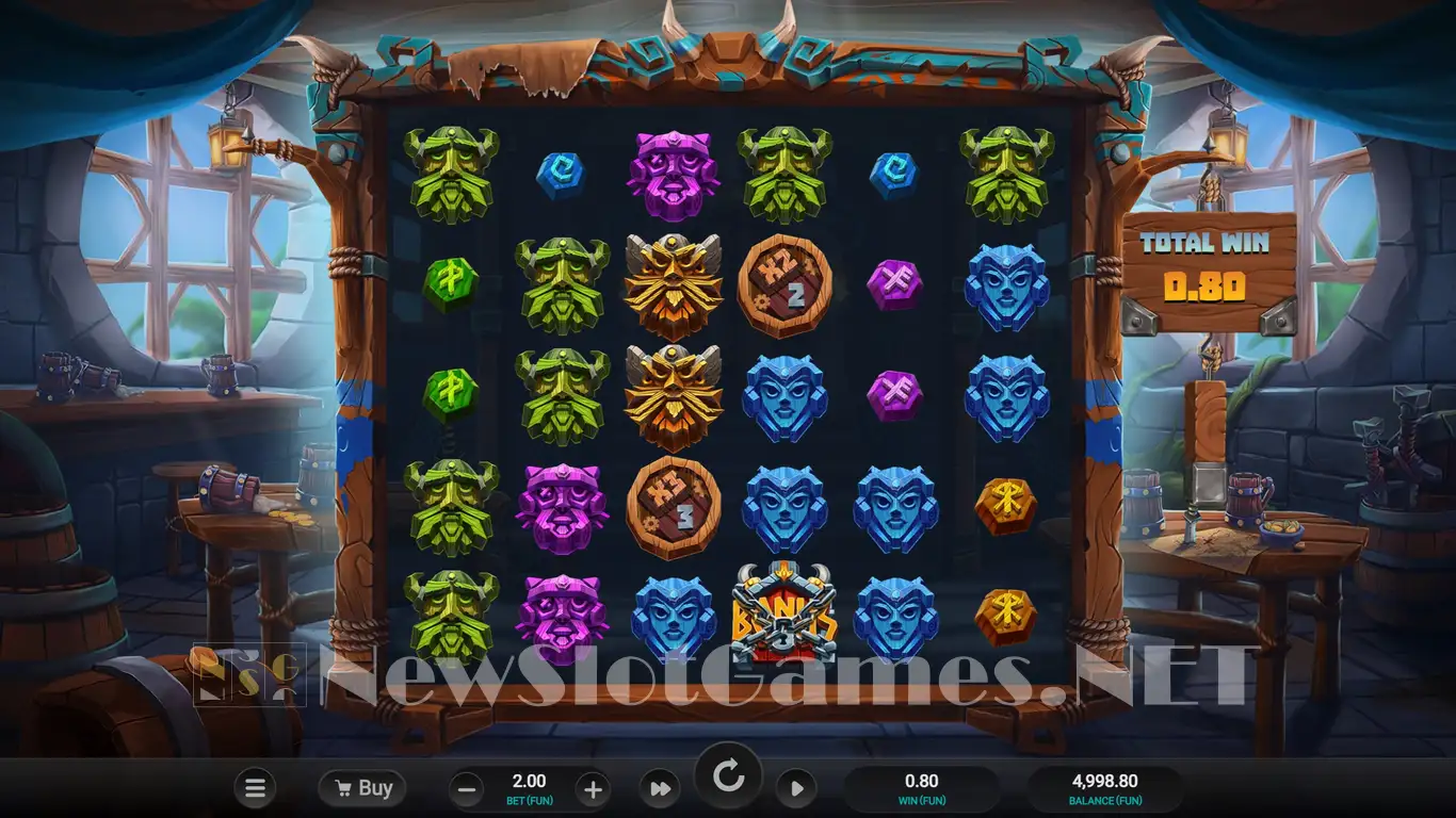 A Viking-themed game, this is a slot machine whose 5 tall reels are placed against the backdrop of a Nordic bar. You see the tables to the sides, there are barrels nearby, but there isn’t anyone sitting there. The reels are well decorated, with wood, rope and horns.