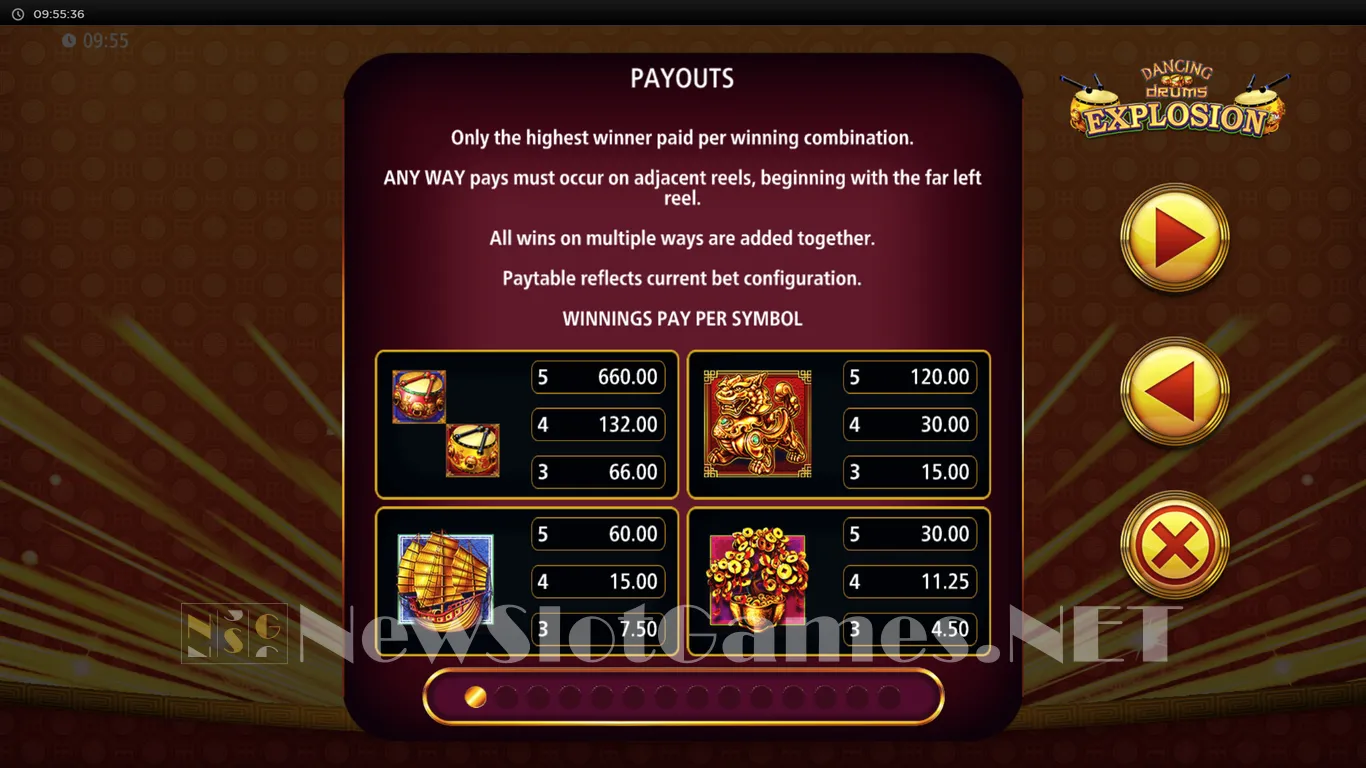 A list of symbols is provided, which includes images of the Drums, a Fu Bat wild, Chinese Sail Ships, Lions, Money Trees, Gold Ingots, Gold Coins, plus the half a dozen standard Royals (9-A).
