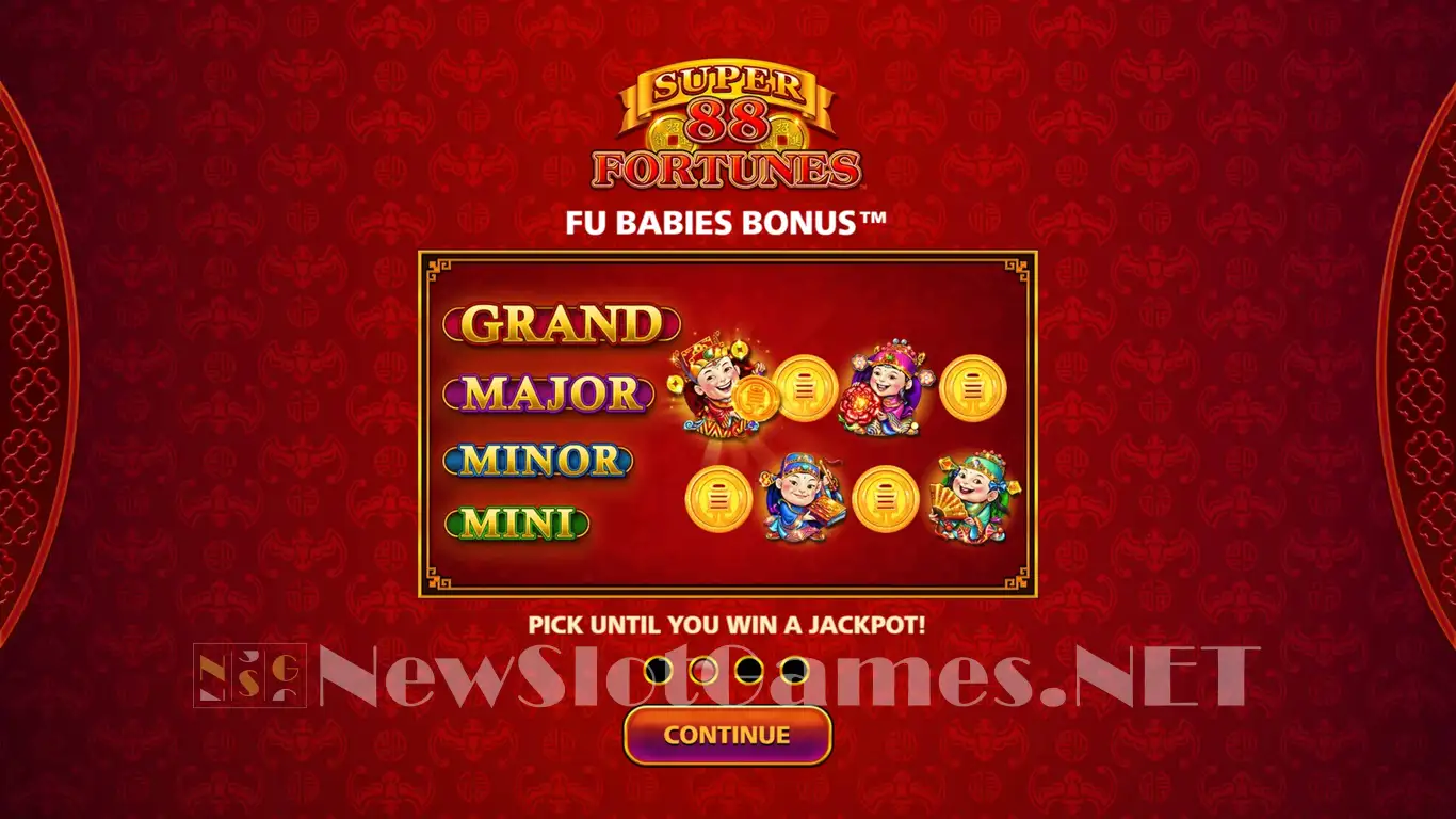 The 2nd reel is where you can sometimes find the wild symbol, which can replace all regular symbols, helping them when they form combinations. A multiplier of 2x to 88x can randomly apply to the wins where wilds were involved. Also, randomly, the wild’s presence can trigger the Fu Babies Bonus, where you make picks and try to claim a jackpot. The Gong symbol lands on reels 1 and 3 and triggers free spins when there is also a wild on the 2nd reel.