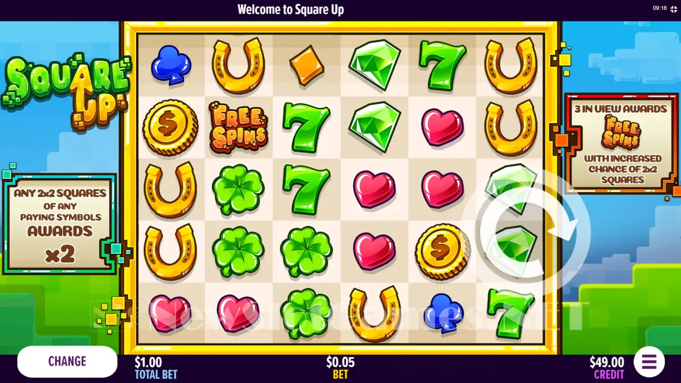 Among the features that will make the Square UP slot special, I will mention the wild symbol, as well as the free spins. You can get 5 free spins with additional stacked symbols available. A 2x bonus feature will also be available if you can form a Super Square (2x2 matching symbols are required to be arranged first).