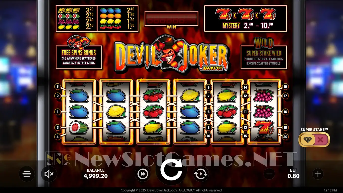 Stakelogic’s Devil Joker Jackpot comes with a joker in the lead role, and he does look like an evil one, inspired by the devil. The rest of the symbols in view range from the Red Seven with the devil’s tail, to Wilds, bells, a watermelon, a grape, a pear, a plum, an orange, a lemon, and cherries.