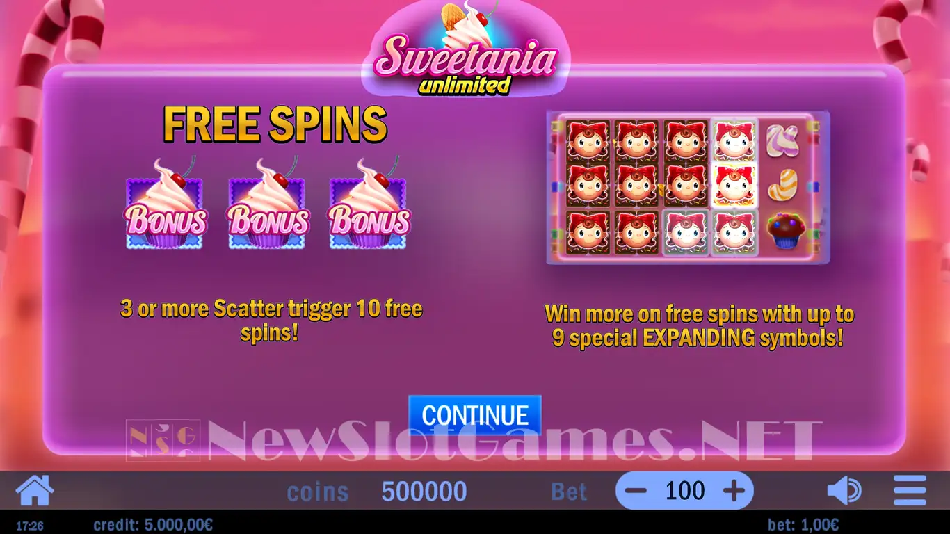 • €/$0.05100.00 per spin is a starting bet in the Sweetania Unlimited