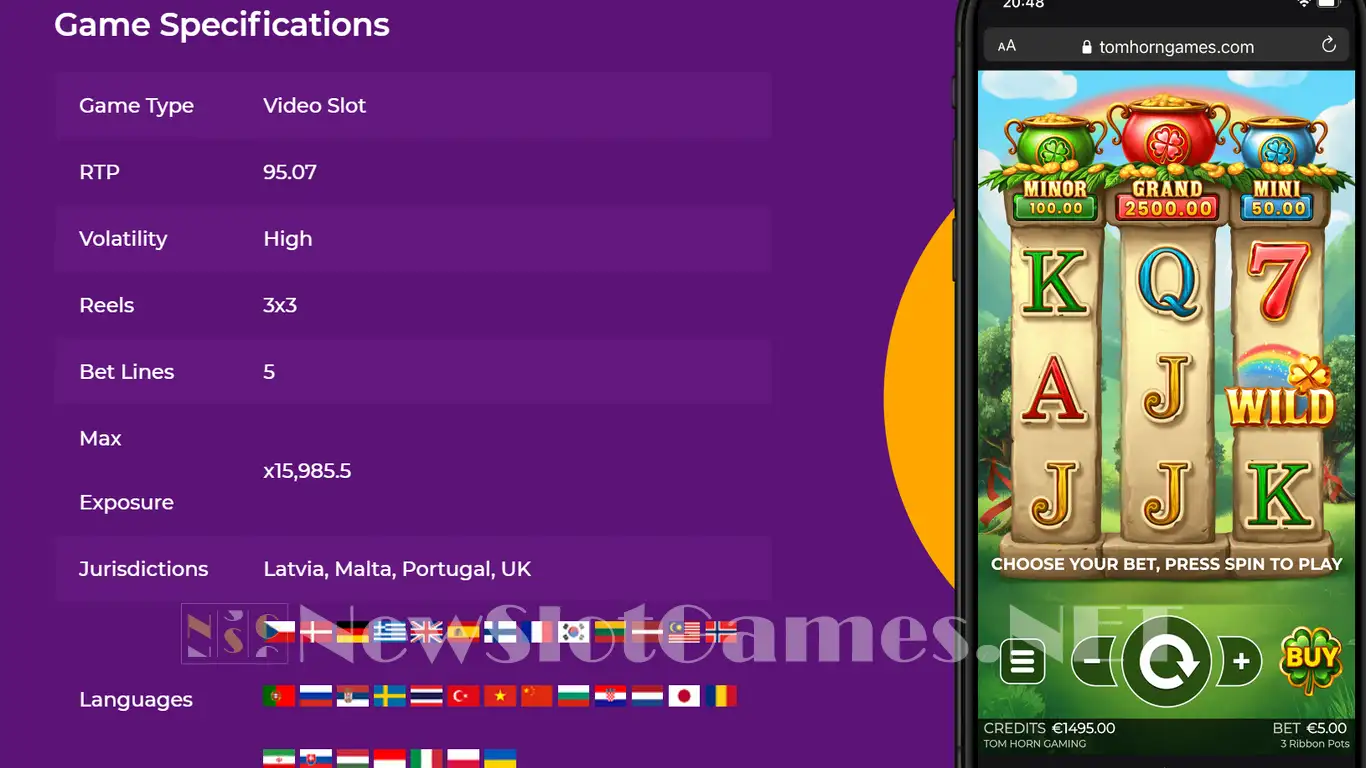 3 Ribbon Pots, one of Tom Horn Gaming’s new slots, is Irish-themed, gives you a small game area to play on, but it’s also doing a great job of offering a big top prize. 3x3 reels will spin for you each round, and there will be 5 lines active there. The bets will go up to $100, starting from a fairly low point. You should take into account the 95.07% RTP and the high volatility of this slot, but there is good news as well. I’m referring to the top jackpot, worth an excellent 15,985.50x the stake.