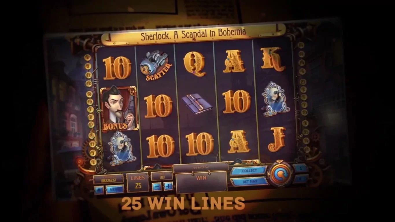 A bet that’s selected for Sherlock A Scandal in Bohemia is going to be required to cover 25 lines, and as you will notice in the bottom left corner, there is no way for you to change that. The only option that can be used by the player is to modify the amount which goes to each line, the coin value if you will. $0.25 is the most likely minimum bet which can be selected, with medium to high options being offered as well.
