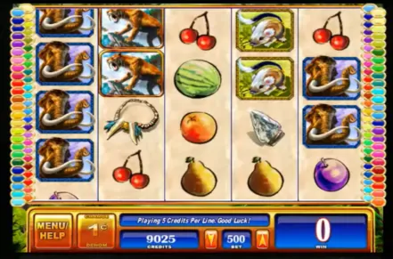 The ice age-themed design will take us back to prehistoric times, where we find all sorts of animals that are no longer among us. From the sabertooth tiger that’s the star of the game to rhinos, woolly mammoths, small rodents, teeth necklaces, flint arrowheads, campfires, and various classic fruits, the symbols generally have a good design. Overall, I found it a more appealing option than many others present in the WMS collection of slots.