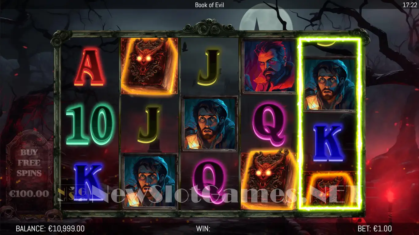 Book of Evil features creatures of the night, the vampires that look menacing getting the lead roles among the regular symbols. There are a total of four premium symbols showing characters, with vampires and humans both represented. The other five regular symbols are the Royals in neon colors. Of course, the Book symbol is the star, featuring the image of a demon on it.