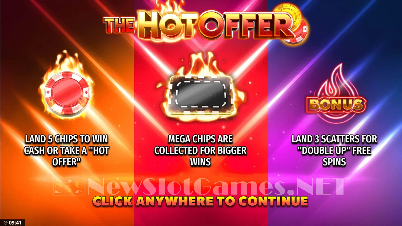 Hot Offer is a bonus feature that requires 5+ Chips or Megachips on the reels at the same time. It collects the values from all visible chips, and pays you. If Mystery Chips are present, you get a Hot Offer, which you can take or reject (in which case you find out what the Mystery offer is).