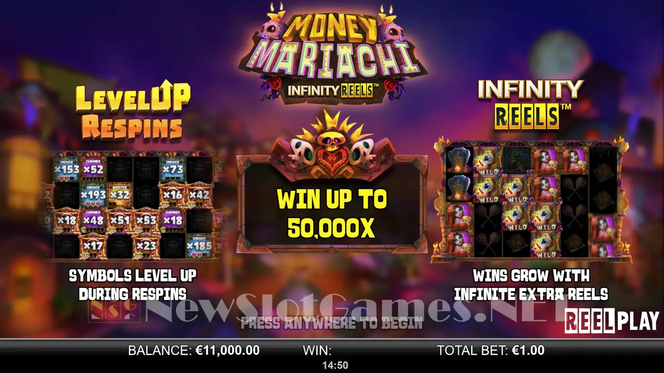 Money Mariachi: Infinity Reels will start with 3x4 reels and can expand the game area for as long as you get new winning symbols for its combinations. Huge wins, capped at 50,000x the stake, are a possibility in its case. A significant number of features have also been implemented, ranging from wilds and scatters, to symbol multipliers, the Infinity bonus, or the LevelUp Respins with upgrades and special symbols.